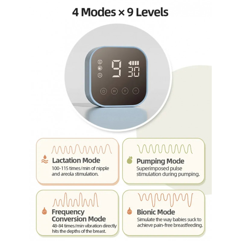 - 4 режима × 9 уровней. Лактация/сцеживание/преобразование частоты/бионика.