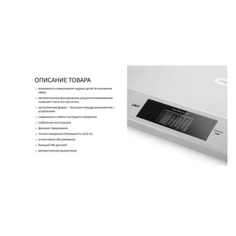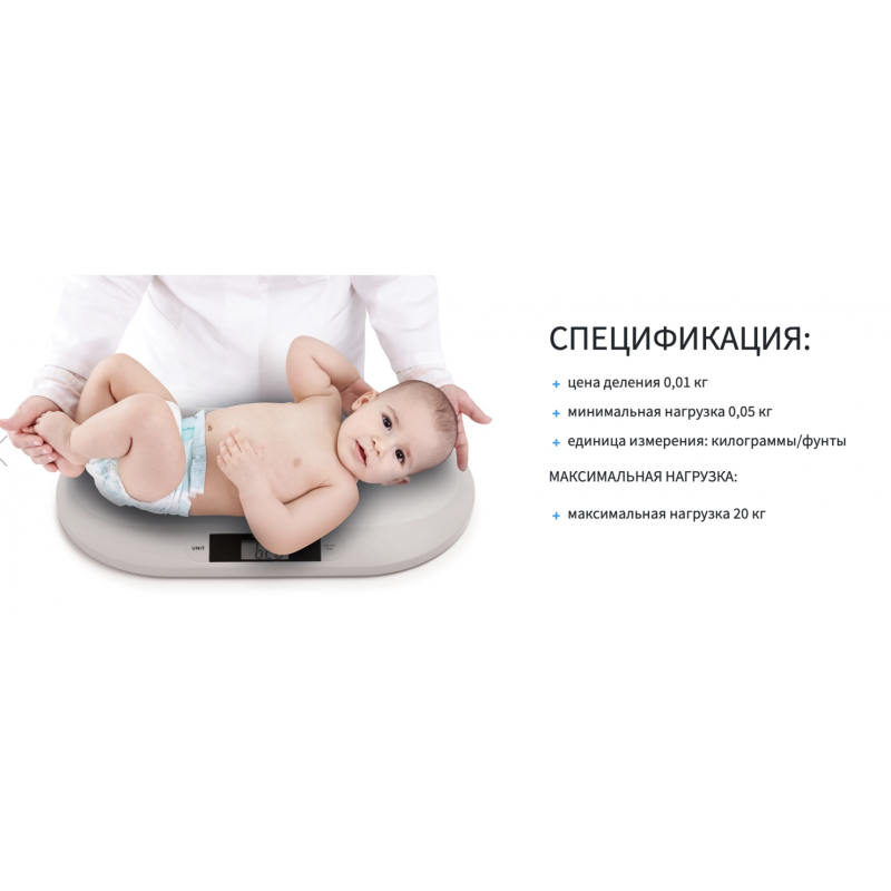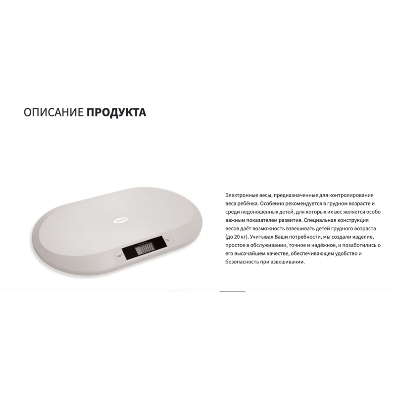 Электронные весы, предназначенные для контролирования веса ребёнка. Особенно рекомендуется в грудном возрасте и среди недоношенных детей, для которых их вес является особо важным показателем развития. Специальная конструкция весов даёт возможность взвешивать детей грудного возраста (до 20 кг). Учитывая Ваши потребности, мы создали изделие, простое в обслуживании, точное и надёжное, и позаботились о его высочайшем качестве, обеспечивающем удобство и безопасность при взвешивании.