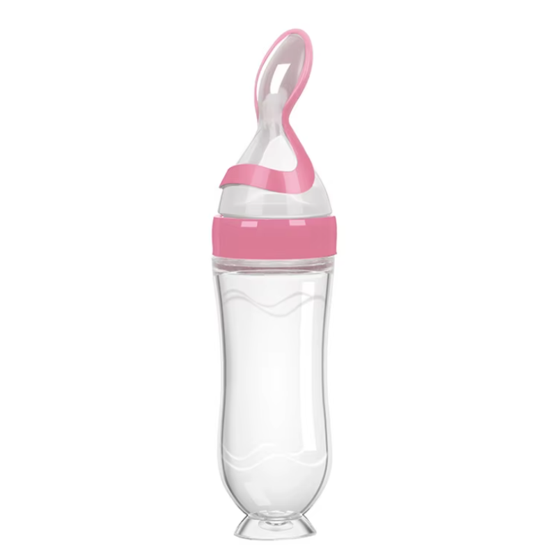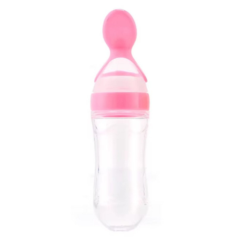Необычная бутылочка для кормления. Сама бутылочка (объем 90 мл) из силикона (т.е. она мягкая и ее можно сжимать), а на нее одевается насадка с ложечкой на конце пластиковая. В ложечке отверстие, через которое содержимое бутылочки выливается в ложку. Если не сдавливать бутылку, то выливается очень медленно, по капле (т.е не обольетесь).