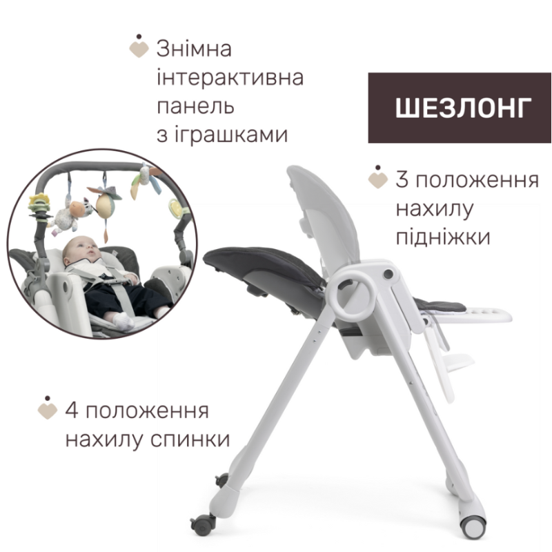 - Панель с игрушками имеет 3 положения, развивает координацию движений, стимулирует развитие тактильных и визуальных навыков у ребенка.