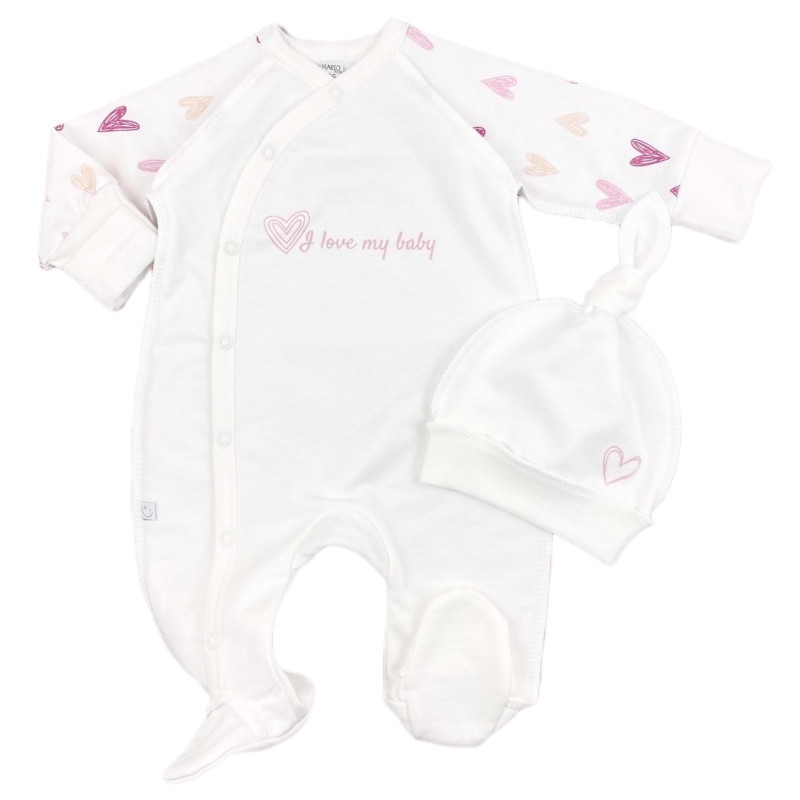 Человечек с шапочкой RoyalBaby Молочный с малиновыми сердечками (байка) р.56, 0-3 мес