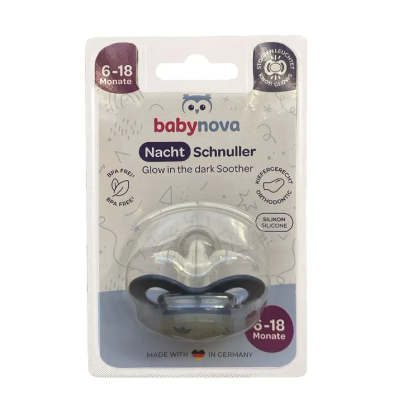 Пустышка силиконовая ортодонтическая ночная Baby-Nova голубая 0-6 мес, 1шт.