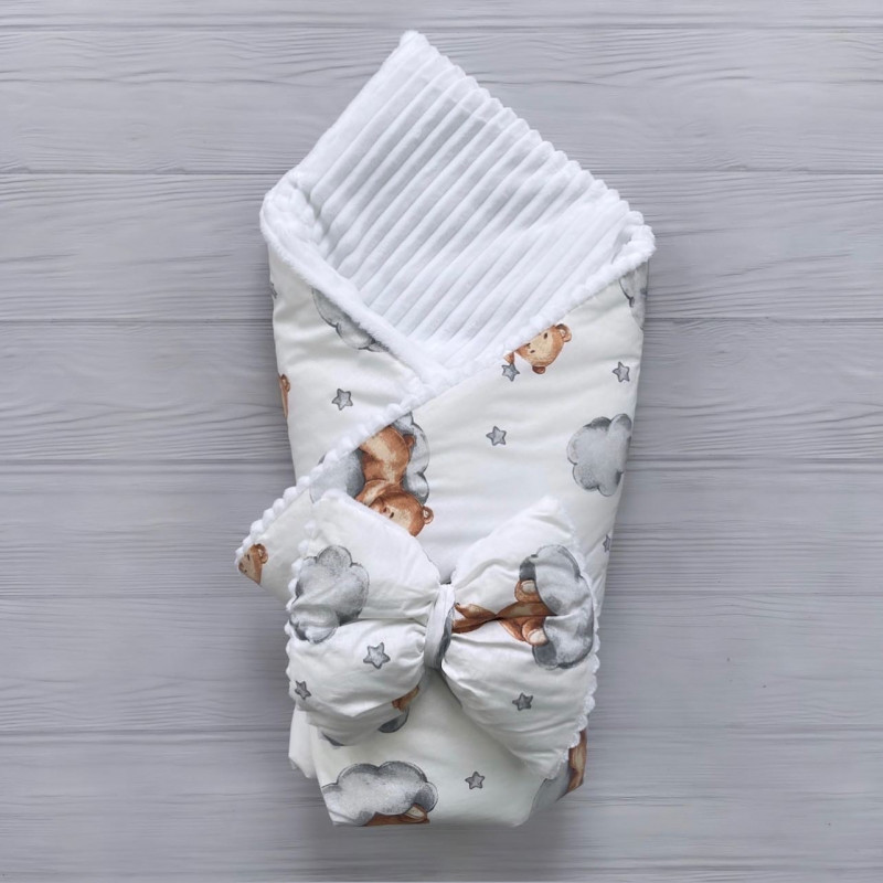 Плед со съемным утеплителем Mommy Bag №6 Мишки на облаках (белый плюш) + бант на выписку