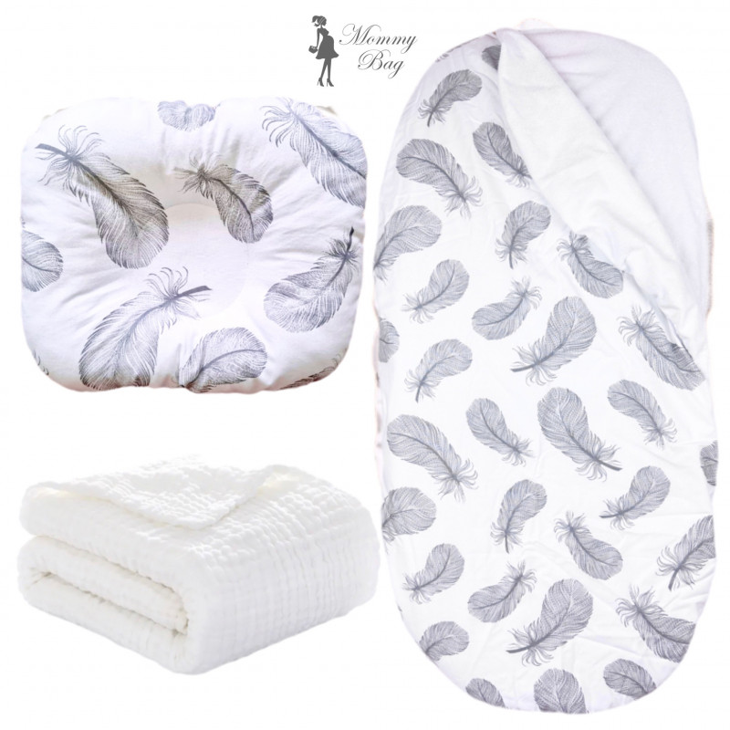 Набор 3в1 в КОЛЯСКЕ RoyalBaby №9 Перья серые с муслиновым пледом