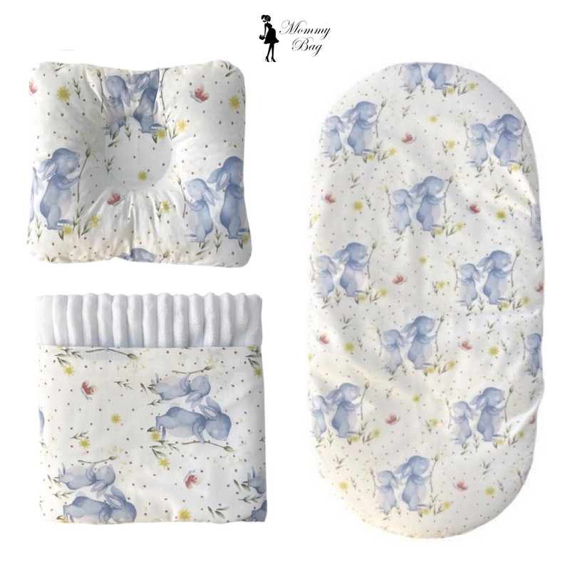 Набор 3в1 в КОЛЯСКУ RoyalBab №36 Зайчики голубые с пледом (с белым плюшем)