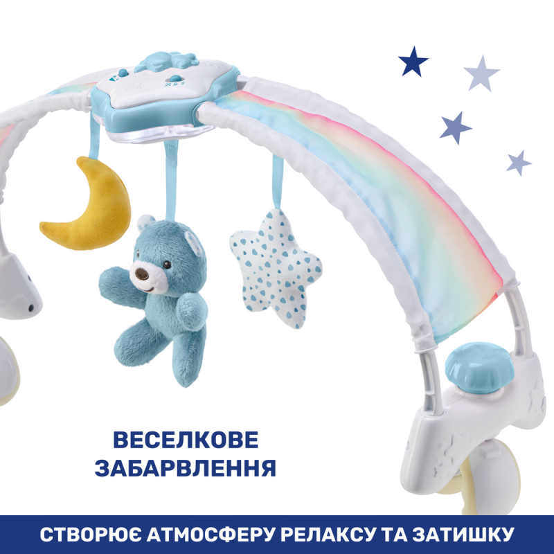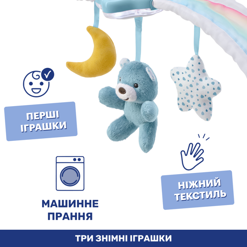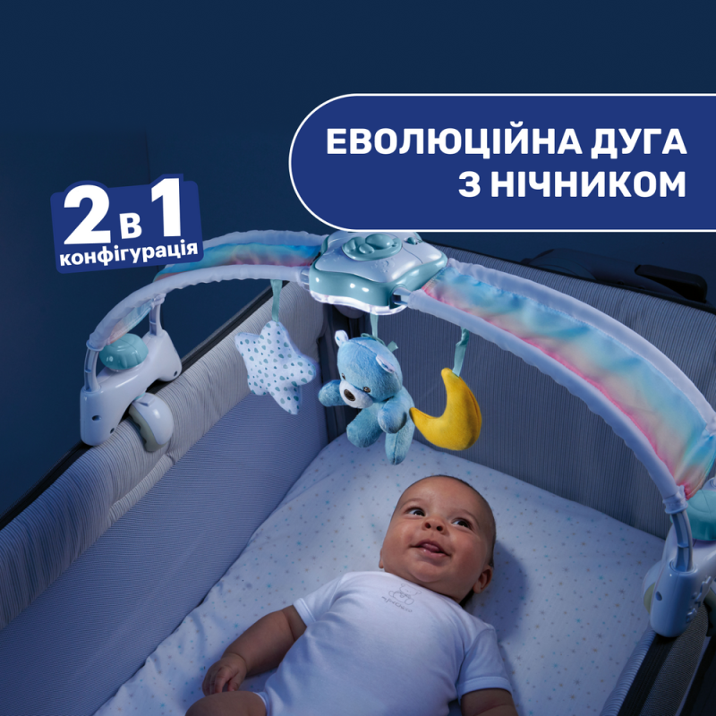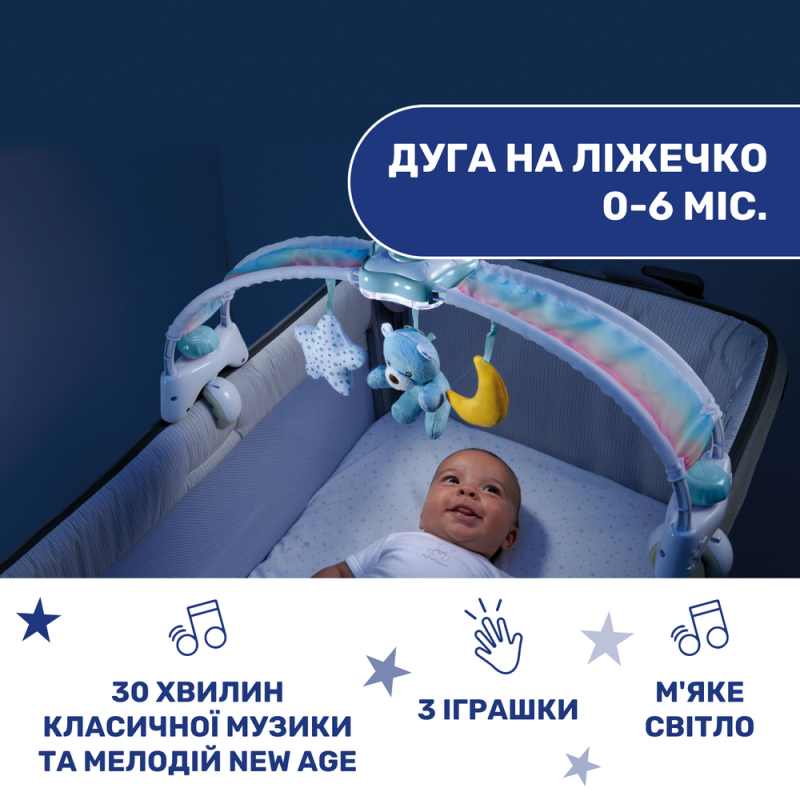 - 0-6 месяцев — дуга для кроватки с мелодиями, световыми эффектами и мягкими игрушками;