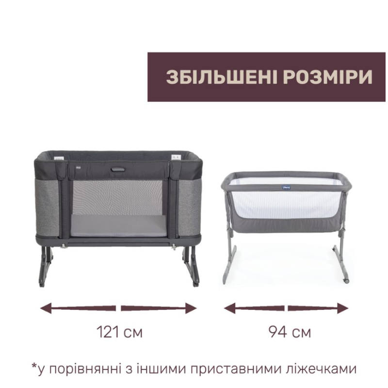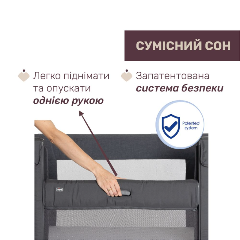 - Безопасность. Next2Me Forever оснащена боковым ограждением с запатентованной системой безопасности, которая предотвращает ее опускание, когда кроватка не полностью прикреплена к кровати родителей.