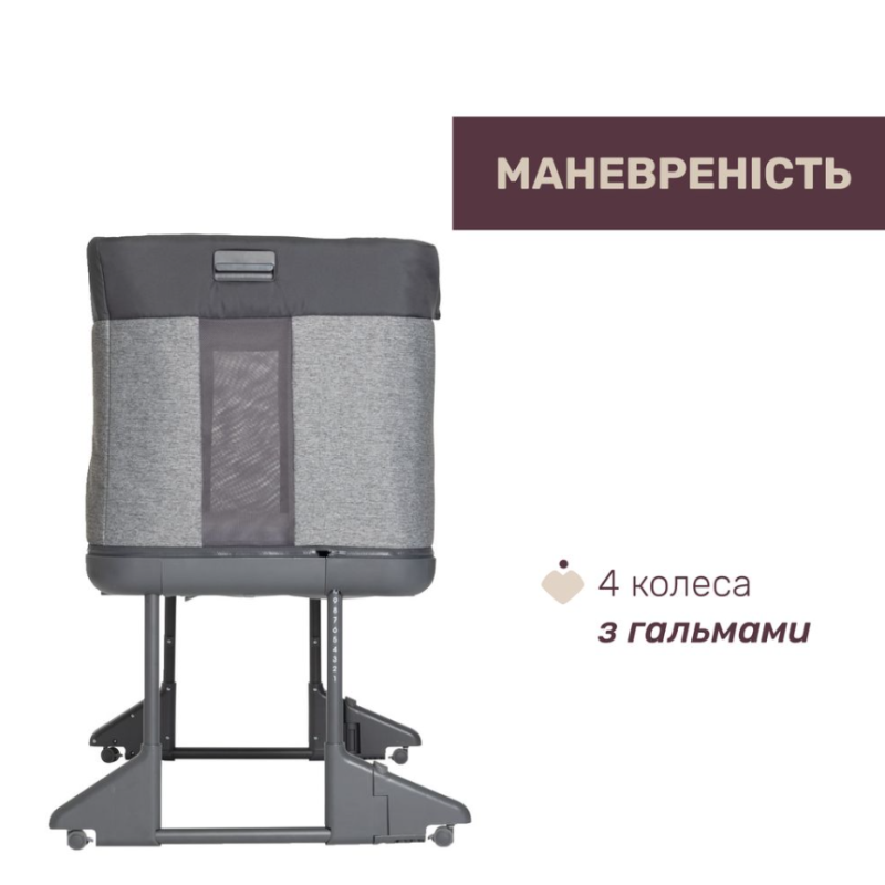 - 4 поворотных колесика с тормозами. Колесики позволяют легко перемещать кроватку по дому без особых усилий.