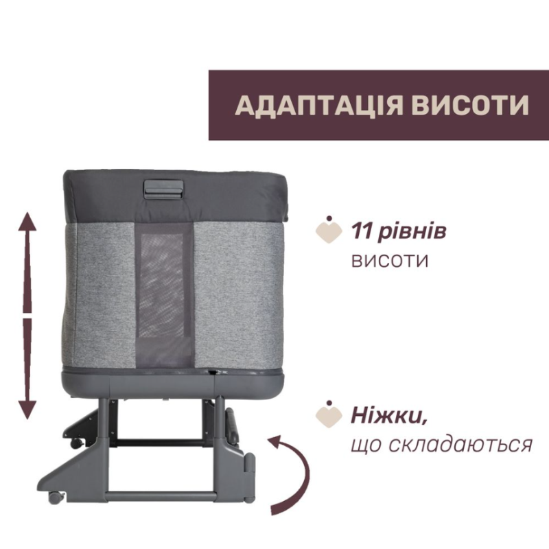 - Подходит для любой кровати. 11 уровней высоты позволяют идеально адаптировать кроватку под взрослую кровать. При наличии ящика или препятствия под кроватью ножки кроватки можно сложить.