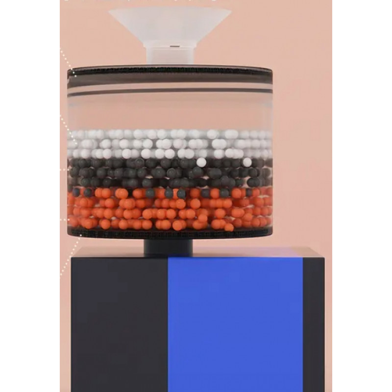 Верхняя часть имеет хлопковый слой и очищает воду от грубых частиц, нижняя часть удаляет тяжелые металлы, смягчает воду, очищает воду от бактерий и улучшает вкус.
